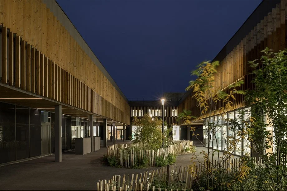 L’emploi de matériaux naturels, la récupération des eaux pluviales en toitures végétalisées, les ilots de fraicheur des cours et leur végétalisation contribuent à développer un bâtiment vertueux, en accord avec son environnement et les défis environnementaux à relever.